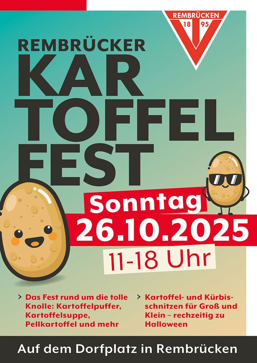 Am Sonntag, den 26. Oktober 2025, findet ab 11 Uhr wieder das herbstlich bunte Kartoffelfest des TV Rembrücken auf dem Dorfplatz zwischen Kirche und Alter Schule statt.